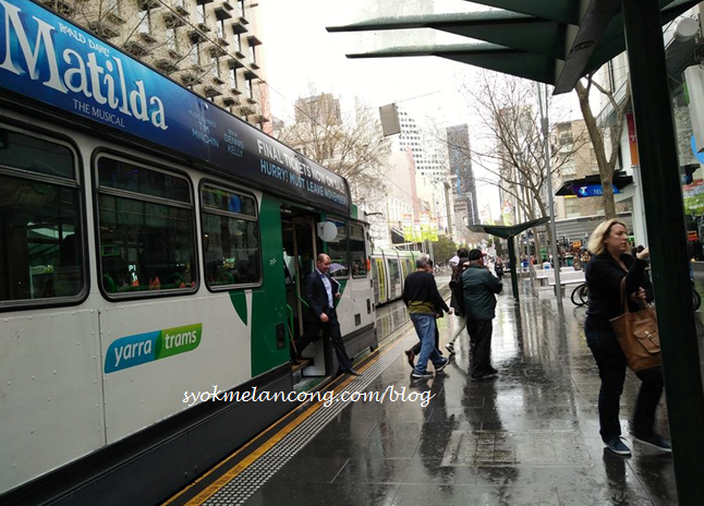 Hujan renyai-renyai di bandar Melbourne ni, tapi ada kalanya lebat juga. Jadi kami ni terpaksalah berjalan dalam hujan nampaknya. Lepas tu kami gerak naik tram untuk ke Hosier lane, lorong street art yang femes di sini.